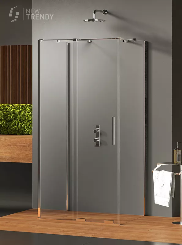 Kabina przyścienna, drzwi pojedyncze, przesuwne zewnętrznie. Bezpieczne hartowane szkło 8 mm pokryte powłoką ochronną Active Shield.