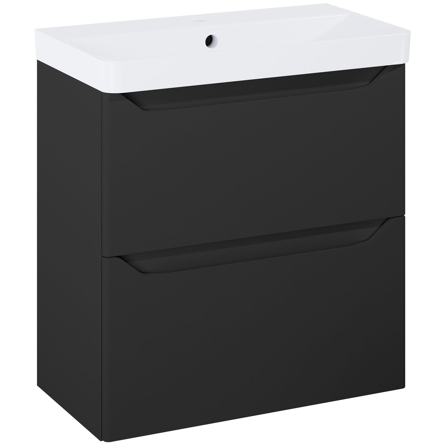 Komplet łazienkowy składający się z szafki i ceramicznej umywalki.