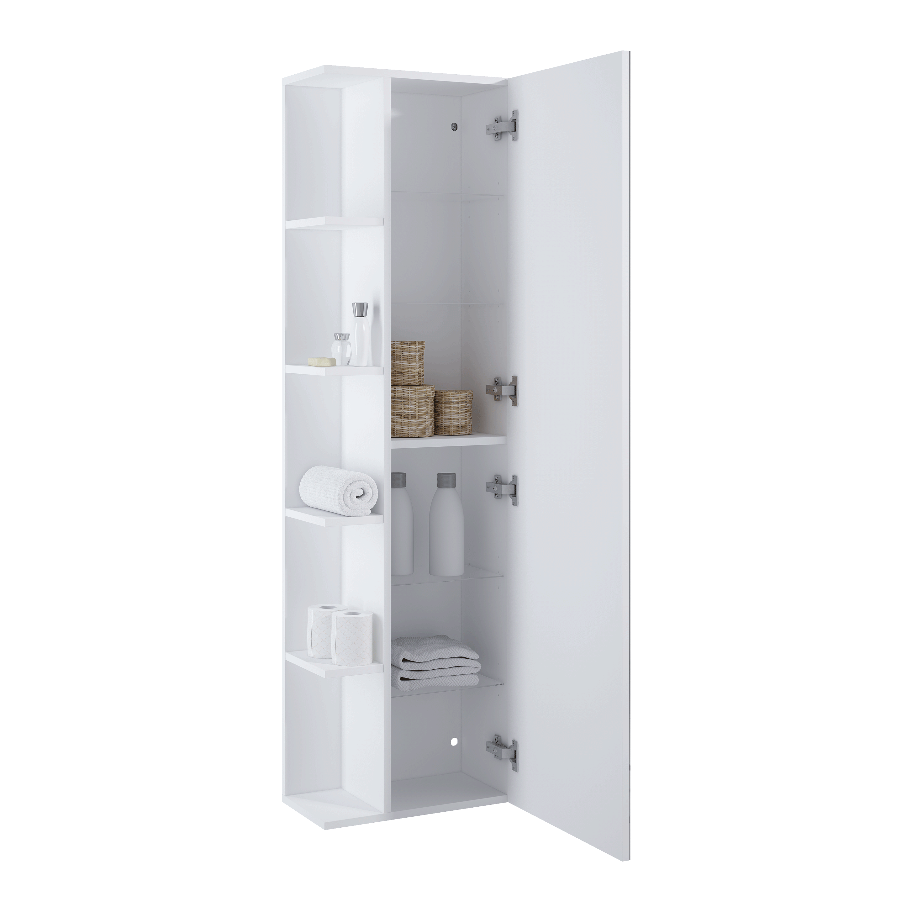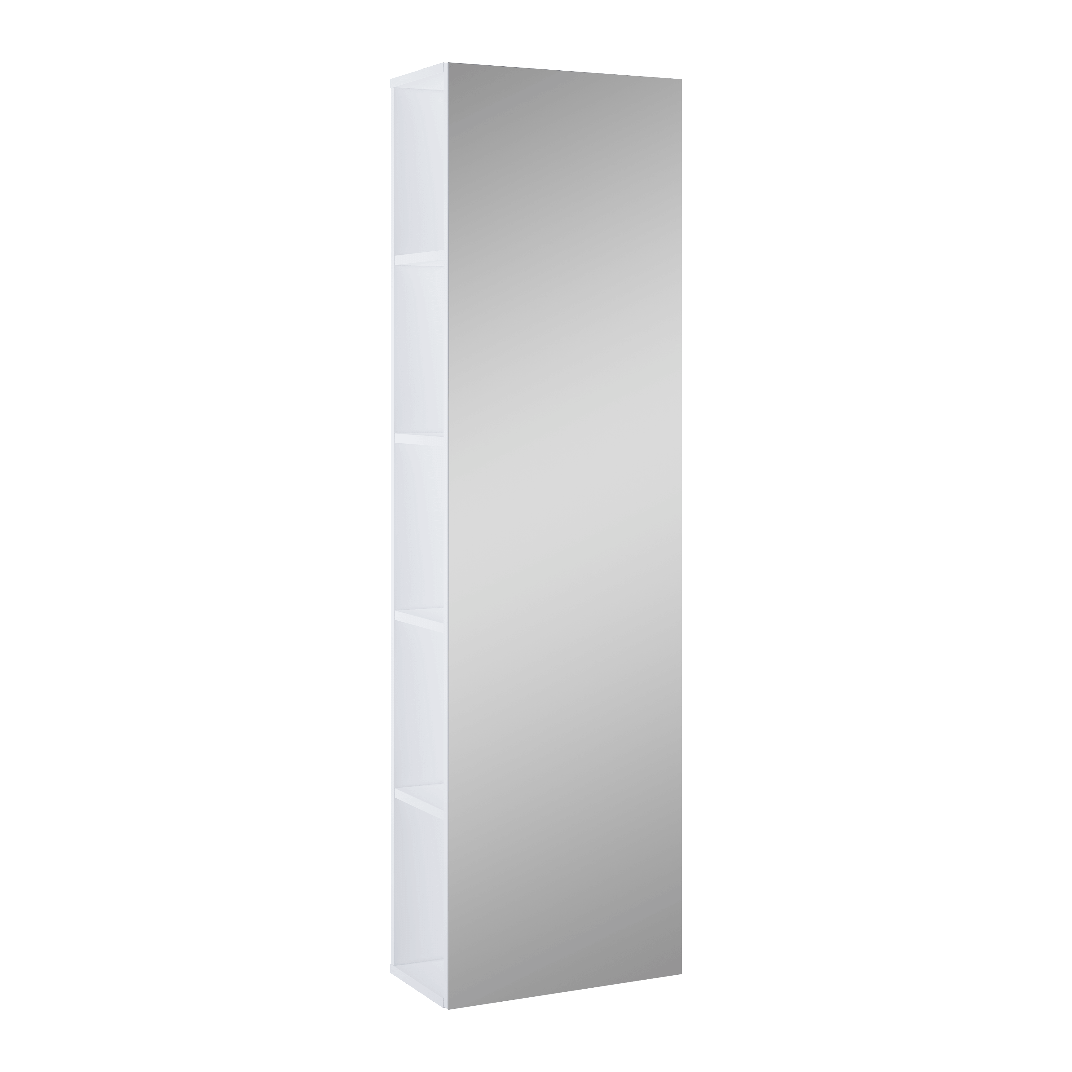 Słupek wiszący z lustrem 43 cm, 1 drzwiczki, wyposażony w 4 szklane, wewnetrzne półki z regulowaną wysokością oraz 5 zewnętrznych półek z płyty laminowanej. Wykonany z materiałów wysokiej jakości, korpus lakierowany, front tafla lustra 3 mm zamontowana na płycie 16 mm laminowanej, zawiasy wypinane z funkcją cichego samodomyku.
