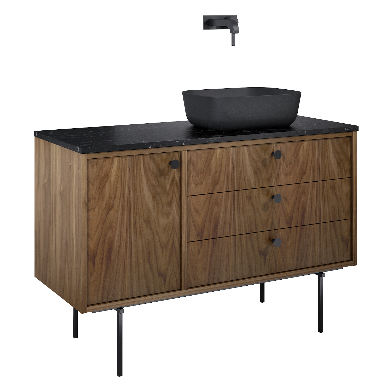 Szafka Legacy to tradycyjny mebel wykonany z materiałów wysokiej jakości, front i korpus z płyty MDF pokrytej wyselekcjonowanym fornirem. W pojemnych szufladach zastosowano funkcję pełnego wysuwu i cichego samodomyku, drzwiczki wyposażone w zawiasy z cichym domykiem. Szafka posiada szklaną półkę z regulowaną wysokością. Szafkę uzupełniają punktowe uchwyty w trzech kolorach: gold, black i antique silver oraz klasyczne, proste nóżki wykonane z metalu. Uchwyty oraz nóżki do nabycia osobno. Szafka przeznaczona do kompletowania z blatem, który należy nabyć osobno.