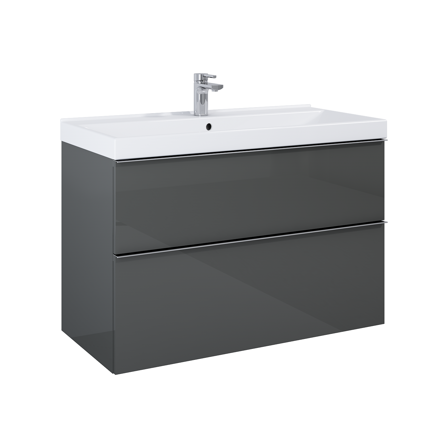 Szafka podumywalkowa Look 100 cm anthracite, 2 szuflady z funkcją cichego samodomyku i pełnym wysuwem. Pierwsza szuflada zaopatrzona w organizer. Szafka wykonana z materiałów wysokiej jakości, front i korpus z płyty laminowanej, lakierowanej na wyoski połysk, uchwyty metalowe w kolorze chrom połysk. Szafka przygotowana do łączenia z umywalką lub blatem.