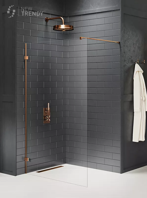 Kabina typu walk-in, bezpieczne hartowane szkło 6mm lub 8 mm pokryte powłoką ochronną Active Shield.
