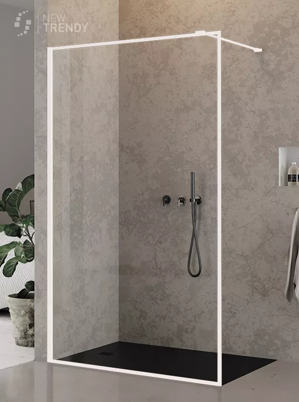 LINIA PLATINUM Kabina typu walk-in, bezpieczne hartowane szkło 8 mm, pokryte powłoką ochronną Active Shield. Ramka dekoracyjna wykonana w technice nadruku farbą ceramiczną.