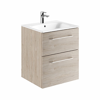 Zestaw meblowy 55 cm składający się z: Umywalka prostokątna z niskim rantem 55 x 50,2 cm + Szafka z 2 szufladami 55 x 63,5 x 50,2 cm, Kolor: orzech włoski jasny. Szuflady z mechanizmem cichego domykania. Uchwyt chromowany. W komplecie: instrukcja montażu, zestaw montażowy.